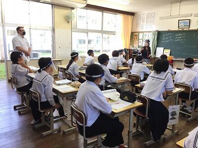 1年生の英語です。英語での受け答えをしています。ALTの先生も英語で質問しています。↓