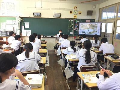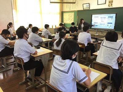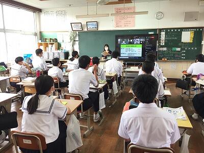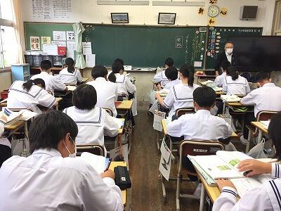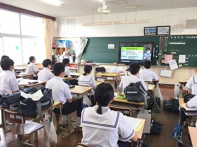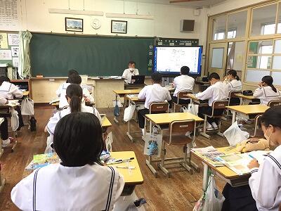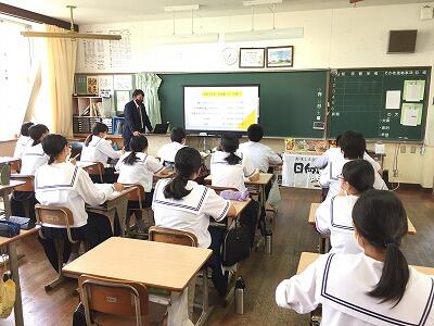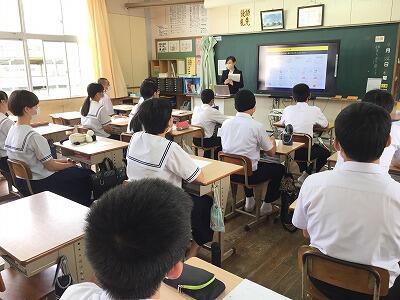 本日、2年生を対象に「県内事業者と中学生との交流会」が行われました。三事業所が来校され、会社や仕事の説明をしたり、生徒の質問に答えたりしてくださいました。