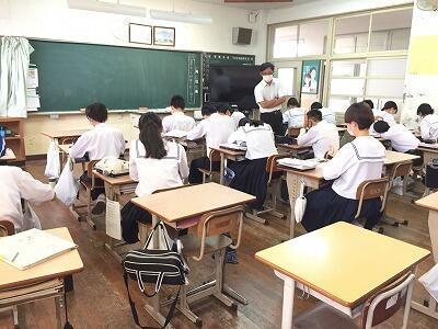 2年の理科です。授業の前に先生の話を聞いています。↓