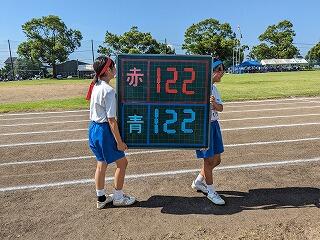 競技の部は、赤団435点。そして青団も435点。同点となり、「両団優勝」というおそらく国光原中はじまって以来の奇跡的な結果となりました。応援の部は、わずかな差で赤団が勝ち、応援賞を獲得しました。