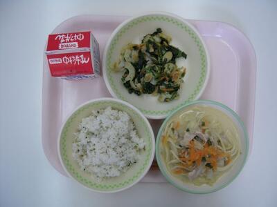 今日の給食献立は、「ラーメン」「ほうれんそうのアーモンドあえ」「いりこなめし」「牛乳」です。
