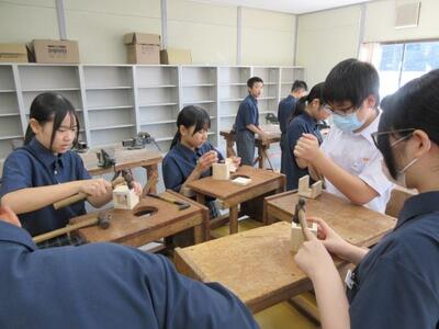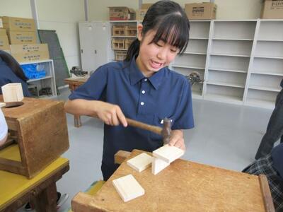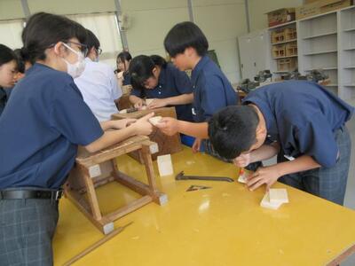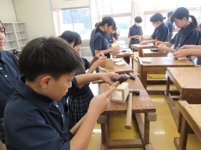今日の授業の様子です。1年生技術です。「げんのう(かなづち)」を使って「トントン」と、音がします。何を作っているのかと覗いてみると、「ペン立て」です。「釘がまっすぐ入らず、横から出てきました。」とか「釘が曲がりました。」などの声も聞こえてきます。中には、「角をしっかり揃えて・・・。」と言い聞かせながら、入念に仕上げる生徒もいました。