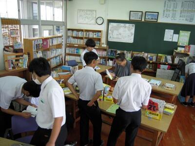 本校でも、その課題図書を購入し、図書室に並べています。早速、課題図書に人だかりができました。