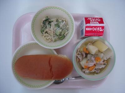 今日の給食献立は、「じゃがいものベーコンに」「ちりめんのすのもの」「ご飯」「牛乳」です。