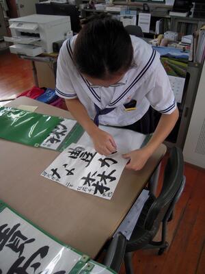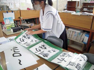 文化発表会でのステージ部門では、合唱コンクールや英語暗唱弁論があります。ステージ部門だけでなく、展示部門もあります。その展示物準備の様子を見つけました。2学期になり、国語の書道で学習し、清書した作品の数々です。