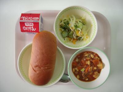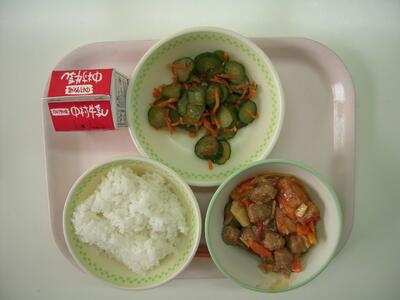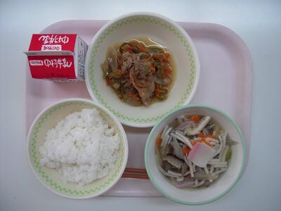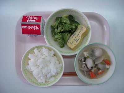 今日の給食献立は、「はまうどんじる」「ぶたにくとやさいのカレーいため」「ご飯」「牛乳」です。
