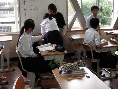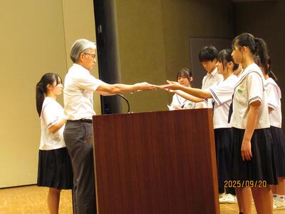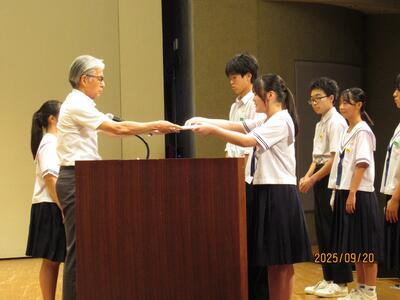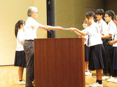 本校では、学校生活の様子をお知らせする通知表を年に2回(4月~9月、10月~3月)配付します。通知表には、毎日の授業の取組の様子を表した評定(5段階)や学校での行動の様子などについて、学級担任の先生からのメッセージ(所見)があります。担任の先生は、一人一人の生徒に、これまでの成長やこれからの期待を込め、お話を交えて渡しています。