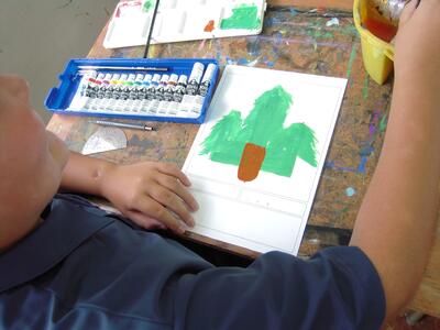 美術の皆さんが、玄関前に絵画を定期的に入れ替えています。今週からは、長友 柚空さんが制作した「湖」です。