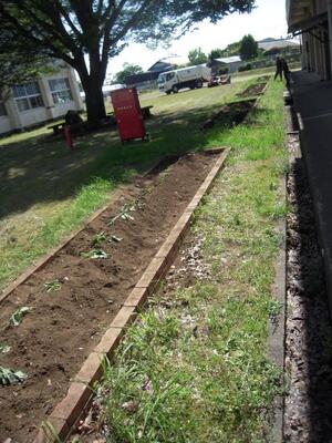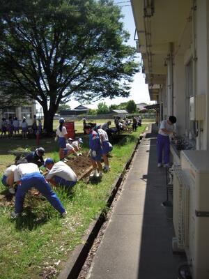 サツマイモを植える畑に生えている草を、全員で抜いています。