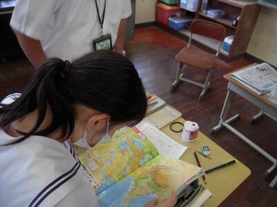 社会科では、地図にある国の名前を探しています。国の形と場所をヒントに探しています。