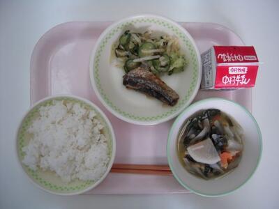 今日の給食献立は、「かぼちゃのいももちじる」「いわしのうめに」「のりかつあえ」「ご飯」「牛乳」です。