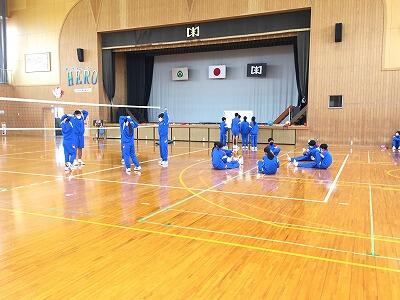 1年生の保体のバレーボールです。班ごとにこの時間の重点目標を決め準備運動です。↓