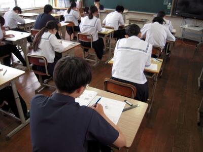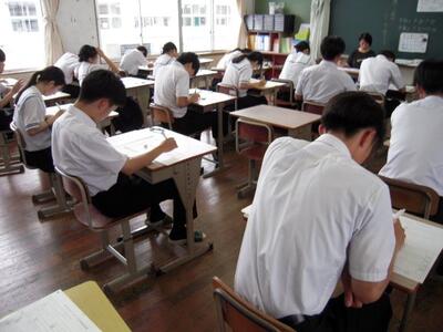 昨日から、3年生は実力テストが実施されています。昨日は、国語、理科、英語。本日は社会、数学です。今回は、1・2年生の学習内容が主に出題されました。回を追うごとに、3年生学習内容の割合が段々と増えていきます。