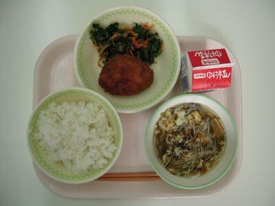 今日の給食献立は、「たまごもずくスープ」「カツオカツ」「ほうれんそうのおかかあえ」「ご飯」「牛乳」です。