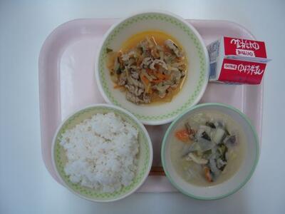 今日の給食献立は、「トロンじる」「キムタクご飯」「牛乳」です。