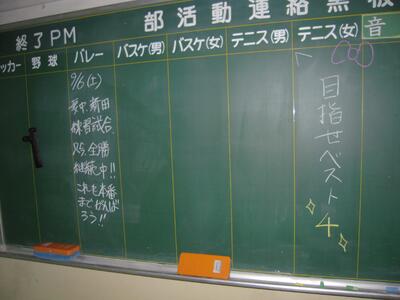 校舎内には、部活動黒板があります。その黒板には、キャプテンが、練習試合や公式試合などの計画を書き込みます。時には、キャプテンの気持ちが書き込まれます。