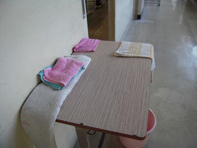 今朝は、壁から染み出てきた雨水を拭き取っていると、2名の生徒が近寄って来ました。そして、2名の生徒は、声を揃えて「先生、何か手伝うことはありませんか?」