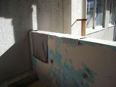 台風の風雨が北寄りであったため、校舎の北側の壁面などから雨漏りがありました。昨日、生徒の皆さんの下校後、先生方は、雨水を集めたり拭き取ったり作業をされました。