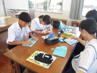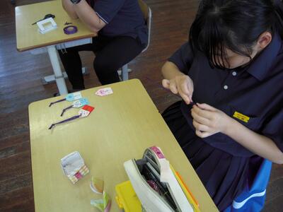 教室の電灯がついているものの、全く音がしません。のぞいてみると、作業学習をしています。何を作っているの?と訪ねると、「折り紙を使ったお守りです。」と返事が返ってきました。