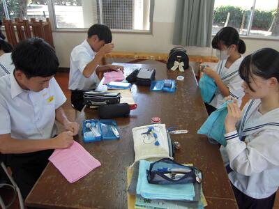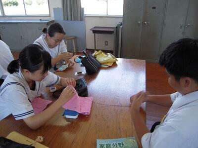2年生が家庭科で「ボタン付け」の練習をしています。
