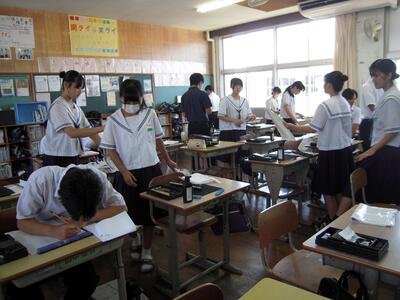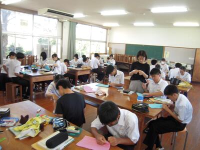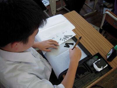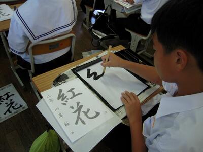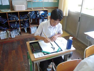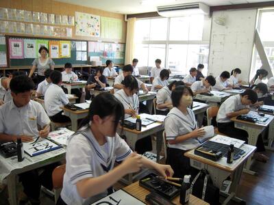 3年生書写です。ちょうど、授業終盤で教室に入りました。片付けをしています。墨汁で手を汚したり制服を汚したりする生徒は、ほとんど見かけません。