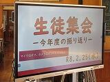 2月25日、今年度最後の生徒集会がオンラインで行われました。生徒集会では各委員会活動(学習、環境、文化、健康、執行)の振り返りと、来年度への課題について報告がありました。自分たちの学校生活をより良くするために、現状の成果と課題を整理し、次年度につなげようとしていました。