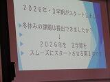 始業式に臨む多くの生徒の皆さんの姿からは、新しい年を迎え、一歩でも前進しようとする意欲が感じられました。3学期は、1年のまとめであると同時に、次の学年へとつながる大切な学期です。一人一人が目標を意識し、日々の学びや生活を大切に積み重ねながら、充実した3学期を過ごしてほしいと願っています。