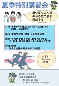 中学校3年生を対象とした高校入試対策のための学習会であるサマースクールを実施します。費用は無料です。高校入試の問題を解く力を付けるために、中学校3年生で行われる実力試験の数学の問題を中心に、宮崎大学教育学部数学科の学生が指導をしてくれます。
