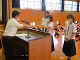 夏休みに入り、更新を怠けておりました。申し訳ございませんでした。さて、昨日、町教育委員会による中学校総合体育大会の「九州・全国大会に向けた激励会」が行われました。本校からは、今回の県大会を勝ち抜いた、女子剣道部と弓道の陶山元気さんが、参加しました。女子剣道部は、今月の9・10日に宮崎県ひなた武道館において九州大会、20日に神奈川県において全国大会に参加します。また、陶山さんは、7日に都城市早水公園文化センターにおいて九州大会に出場いたします。大会出場にあたり多大なご支援をいただきます都農町さまに心より感謝申し上げます。よい報告ができるよう頑張ってくれることを心より願っております。本当にありがとうございました。