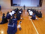 1月16日(火) 本日の6校時とTTの時間に、火災想定の「防災教室」を行いました。東児湯消防組合・都農分遣所から3名の方にお越し頂き、火災発生時の避難の仕方や注意点などについて学びました。また、煙中体験を行い、火災発生時の煙の怖さや行動の仕方などを実際に模擬体験しました。
