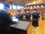 11月6日(月) 先週、2日(木)の「合唱コンクール」の後に、『生徒会役員任命式』・『退任式』が行われました。旧生徒会長の河野迅真さんをはじめ5名の生徒会役員と全校専門委員長・副委員長のみなさんが退任のあいさつを行い、新生徒会役員及び新全校専門委員長・副委員長のみなさんから感謝状と記念品が贈られました。その後、新生徒会役員及び新全校専門委員長・副委員長のみなさんに、一人ずつ「任命証」が授与されました。新生徒会執行部は、【生徒会長】:河野優希さん(2-1)、【副会長】:河野宗二朗さん(2-1)、黒木奏那さん(2-2)、【書記】:河野華恋さん(1-2)、【会計】:大島美優さん(1-3)のみなさんです。新全校専門委員長・副委員長のみなさんについては、後日、別の機会にご紹介したいと思います。新生徒会の今後の活躍に期待したいと思います。