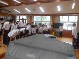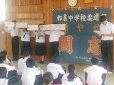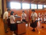 7月13日(木) 7月14日から16日、22日から24日に行われる「宮崎県中学校総合体育大会」及び7月15日に行われる「宮崎県吹奏楽コンクール」の『激励会』を行いました。剣道部、弓道部、柔道部、バドミントン部の各キャプテン及び空手競技、陸上競技に参加する選手が大会に向けての抱負を述べ、選手を代表して剣道部主将の長友桜華さんが選手宣誓を行いました。また、吹奏楽部は、大会で演奏する曲を披露してくれました。各部活動、各選手の健闘を祈りたいと思います。