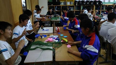 本日(6月8日)5校時の3年生総合的な学習の時間の一コマです。今日は,都農神社夏祭りに向けて,都農中太鼓台に飾る「花飾り」を一生懸命作っています。地域の伝統文化行事への参加は全国でも先駆的です。本校の誇れる伝統の一つです。