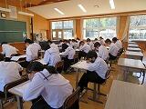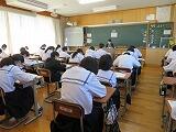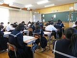 さて、本日の4校時に黒田芳伸教諭の数学の参観授業が3年1組において行われました。最初に小テストを行い、入試問題(関数)に取り組みました。個人で考えたり級友と話し合って問題を解く真剣な姿が印象的でした。今回の相互参観授業は終了しますが、今後も互いに授業を見合う取り組みや授業づくりについて、気軽に話し合う光景が見られるようになることを期待しているところです。