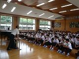 7月5日(金)の6校時、3年生は総合的な学習の時間に「都農神社」と「夏祭り」の歴史について、都農神社の永友謙二宮司様をお招きしてお話をしていただきました。