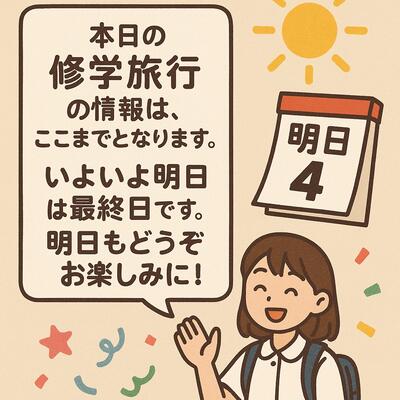 7月2日、本日より、2年生の修学旅行がスタートしました。朝早くから元気に集合し、出発しました。天候にも恵まれ、生徒たちはワクワクした表情で旅に臨んでいます。この3日間が、学びと思い出にあふれた時間となるよう、教職員一同しっかりサポートしてまいります。