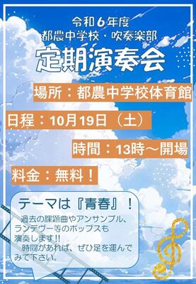 10月19日(土曜日)に都農町立都農中学校吹奏楽部の定期演奏会が行われます。コンクールの課題曲、ポップス等いろいろな曲を楽しく演奏します。チケットは必要ありません。どなたでも、ご来場できます。ぜひ、お越しください!お待ちしております!