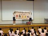 激励会では、まず校長先生から、チームのために自分のできることを精一杯取り組んでほしい旨、話がありました。次に、生徒会代表が、激励の言葉を述べました。次に、各部(野球部、女子バレーボール部、女子テニス部、剣道部、男子バスケットボール部、女子バスケットボール部、バトミントン部、陸上部)の決意表明 と選手宣誓がありました。選手宣誓は、男子バスケットボール部のキャプテンが代表として行いました。とても、立派な選手宣誓で感動的でした。