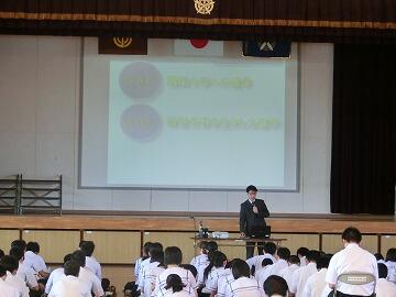 6月22日(木)の5校時に都農神社の永友宮司さんを講師に招いて,体育館での三年生総合的な学習の時間を行いました。この時間は都農神社の夏祭りに向けて,都農町や都農神社の歴史についてお話を聞きました。生徒も知らない事を知り大変興味深く聞いていました。