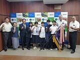 当日は、空手道団体の優勝旗も持参し、久しぶりの快挙を町に報告しました。表敬訪問の場には、これまで空手道の活動に携わってこられた関係者の皆様も駆けつけてくださり、優勝旗に取り付けられた過去の都農中のペナントを懐かしそうに眺めながら記念撮影を行うなど、感慨深いひとときとなりました。懐かしさと喜びが交錯する温かな雰囲気の中、多くの激励の言葉をいただきました。