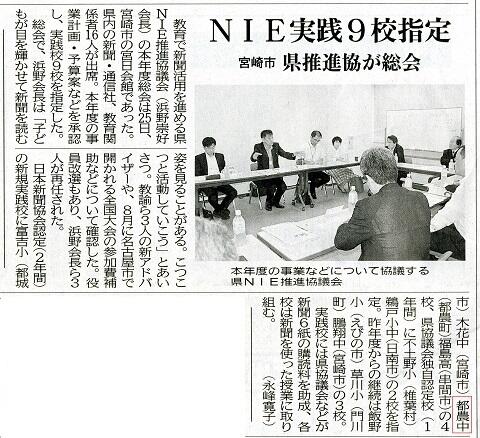 「教育で新聞活用を進める県NIE推進協議会」が5月25日に宮崎市で開かれ,本校が県内9校の実践指定校の一つとして指定されました。関連記事を掲載しますのでご覧ください。(宮﨑日日新聞5月26日)