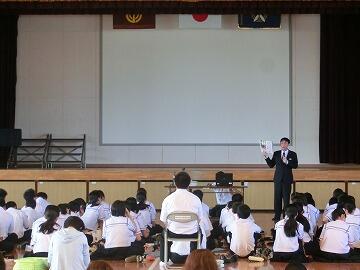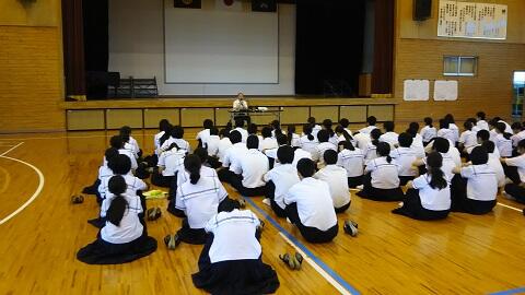 6月22日(木)の5校時に都農神社の永友宮司さんを講師に招いて,体育館での三年生総合的な学習の時間を行いました。この時間は都農神社の夏祭りに向けて,都農町や都農神社の歴史についてお話を聞きました。生徒も知らない事を知り大変興味深く聞いていました。