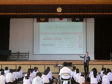 6月22日(木)の5校時に都農神社の永友宮司さんを講師に招いて,体育館での三年生総合的な学習の時間を行いました。この時間は都農神社の夏祭りに向けて,都農町や都農神社の歴史についてお話を聞きました。生徒も知らない事を知り大変興味深く聞いていました。