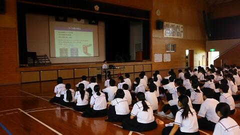 6月22日(木)の6校時に本校体育館で「薬物乱用防止教室」を行いました。講師として高鍋警察署の生活安全課からお二人をお招きし,煙草や薬物の影響についてお話してもらいました。生徒,煙草を吸うと死亡率が上がることや薬物の恐ろしさについてあらためて学びました。