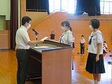本日のT・T(都農タイム)の時間に本年度から取り組んでおります単元テストの第1回目において満点を取った生徒の表彰を行いました。特に写真の3年福嶋日菜子は、社・数・英・理の4教科、1年河野桜さんは、国・数・英の3教科が満点でした。今後も満点の生徒は、表彰を行うとともに、上位の成績優秀生徒については、学年掲示板にて紹介していくことにしています。みなさん、自身の将来を見据え、今、学生としての本分である勉学に真剣に励んでください。
