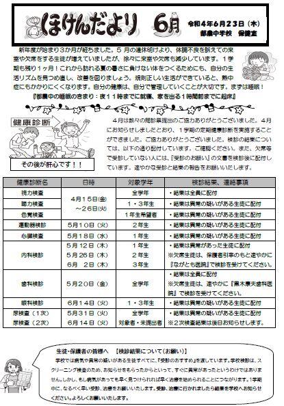 保健だより6月号を配付しました。4月から行われている検診結果、連絡事項についても掲載しておりますので、各ご家庭でご確認お願いいたします。連日の猛暑で熱中症が心配されておりますマスク着用に関してましては、熱中症予防を優先し、部活動時や登下校時ははすすよう指導しています。ご家庭でも熱中症と感染症対策の2つの面でのお話をしていただくとありがたいです。(令和4年度配付分はメニューリストの「学校からの配付文書」でご確認ください。)