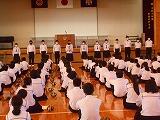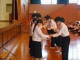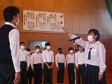 10月24日(月) 旧生徒会役員の「退任式」及び新生徒会役員の「任命式」を行いました。第75代生徒会長の赤尾春香さんが旧生徒会役員を代表して退任の挨拶を行い、第76代生徒会長の河野迅真さんが新生徒会役員を代表して新任の挨拶を行いました。新生徒会には、これまでの生徒会の伝統を伝承し、さらに発展させて欲しいと思います。