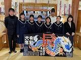 12月27日(水)都農神社御社殿にて、大絵馬奉納の式が行われました。式典には今年の干支を3カ月かけて描いてくれた美術部員と顧問の岩室先生が参加しました。永友宮司からは「みなさんの絵、特に龍の目の輝きから、新しい年が希望に満ちたものになるような力強さを感じる!」とお褒めの言葉をいただきました。みなさん、ぜひ、神社に見に行ってください。また美術部員と宮崎大学地域資源創成学部共同の「彌勒祐徳絵画展」2023 12 彌勒祐徳絵画展ポスター.pdfもお越しください。
