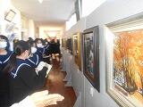 1月16日(火) 19日(金)まで、本校管理棟1階及び旧コンピュータ室で開催中の「都農町絵画教室作品展」及び「弥勒佑徳絵画展」を3年生が鑑賞している様子です。期間中、学年ごとに全校生徒が鑑賞することになっています。