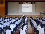 9月7日(木) 本日、全校一斉の道徳の授業として、「薬物乱用防止教室」を行いました。高鍋警察署生活安全課の山本さんを講師としてお招きし、講話をしていただきました。医薬品の正しい使用の仕方や違法薬物の危険性などについてお話をしていただき、薬物乱用によって起こる心身の健康障害についての知識を身に付け、自らの心身の健康の保持増進に対する意欲を高めることができました。講話に対して、全校生徒を代表して、健康委員会全校専門委員長の濱﨑悠人さんが、お礼の言葉を述べてくれました。